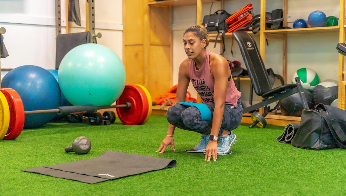 2. Lower your hips toward the ground by bending your front knee, keeping your chest up and your front heel firmly planted on the ground.