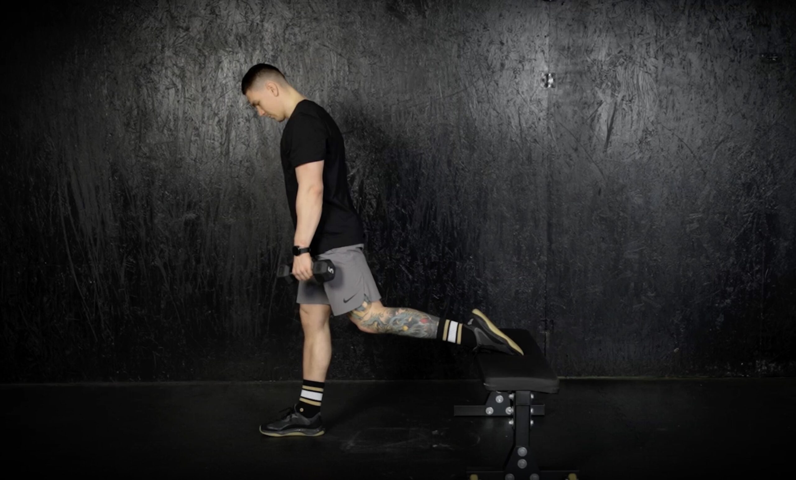 man doing a bulgarian split squat