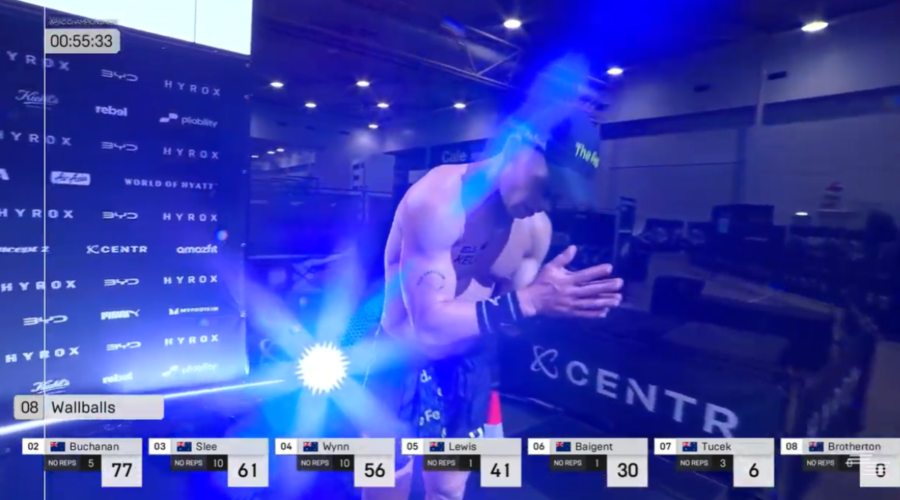 Buchanan got a yellow card on burpee broad jumps. Wynn also received a yellow card. Shepherd was stung by a further two yellow cards on the burpees. Slee and Kelly were neck and neck as they arrived at the rowers. But a 3:47 row for Slee saw him match Kelly’s pace.