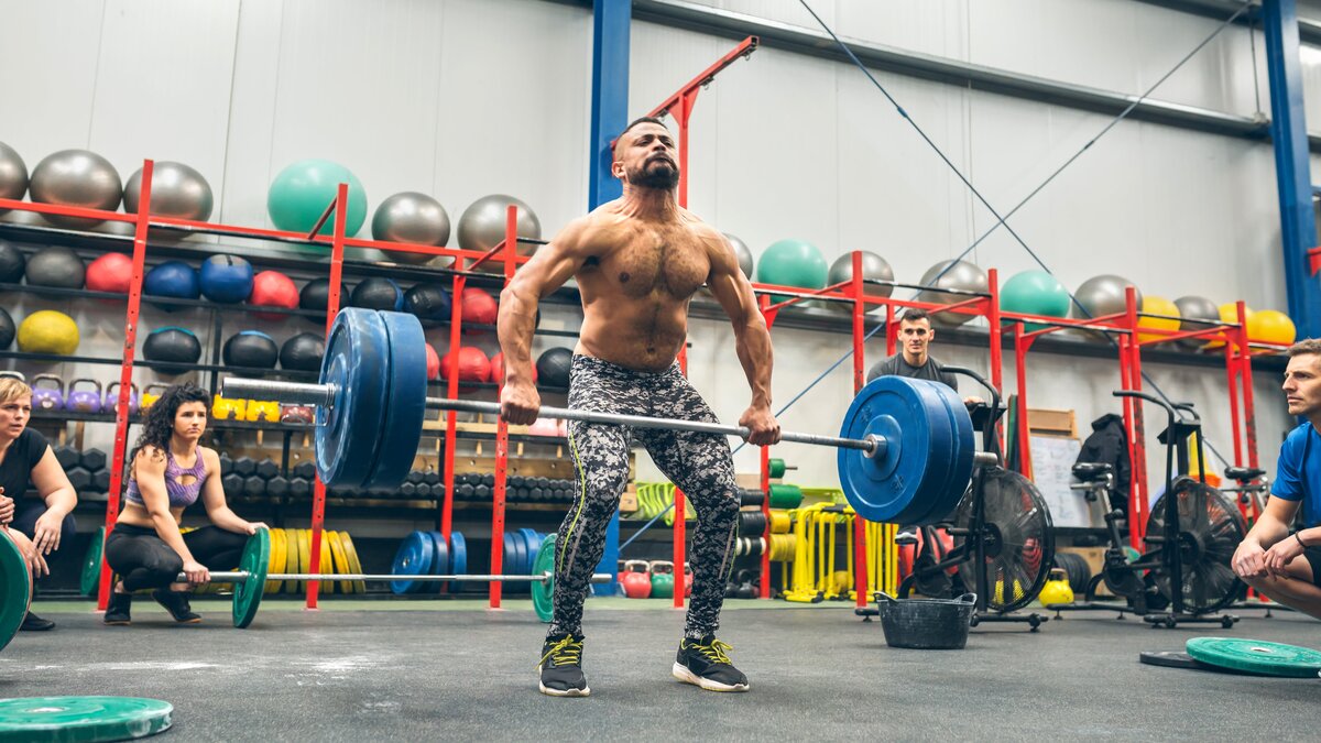 A shirtless man in a gym mid-rep during a barbell deadlift. He is lifting heavy weight with proper form, surrounded by dumbbells and gym equipment.