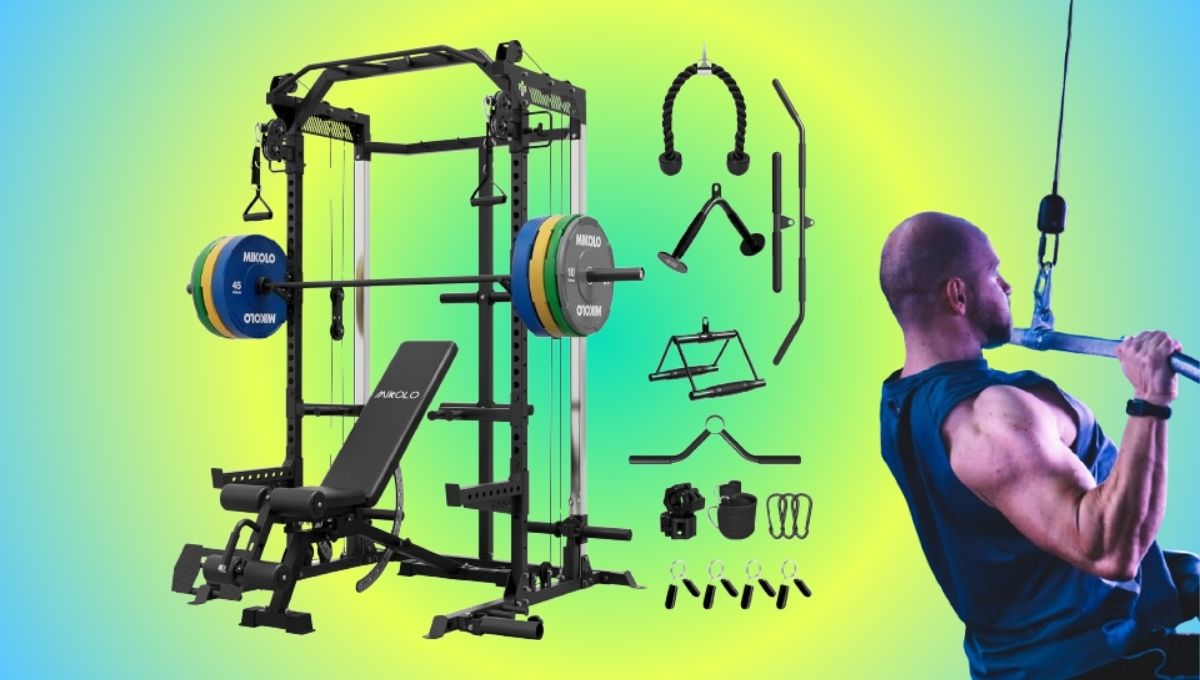 - Attachment-filled: The Mikolo Power Cage bought through our link includes all essential attachments for your daily training, including: four free handle attachments, two safety spotter arms, dip bars, J hooks, and a T-bar row attachment. This provides a wide range of exercises, such as wide and narrow lat pull-downs, T-bar rows, seated cable rows, bench presses, squats, deadlifts, biceps curls, triceps extensions, pull-ups, chin-ups, dips, and more.