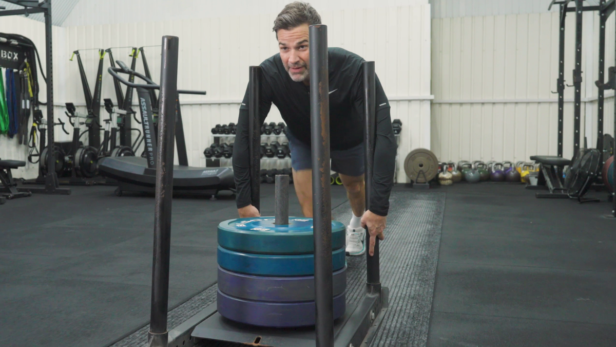The conditioning block in today’s session reflects that challenge. It moves from rower to Ski Erg to short bouts of running and finishes with sled work. The transitions ask for effort but also for pacing. Dimmick keeps an eye on how Jones manages the changes in intensity. The work is demanding but steady, more focused on repeatability than on dramatic output.